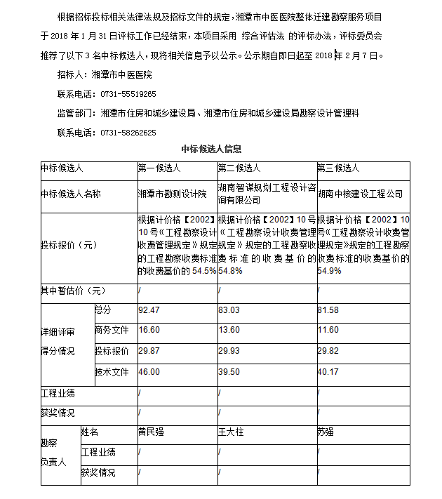 湘潭市中医医院整体迁建勘察服务项目中标候选人公示