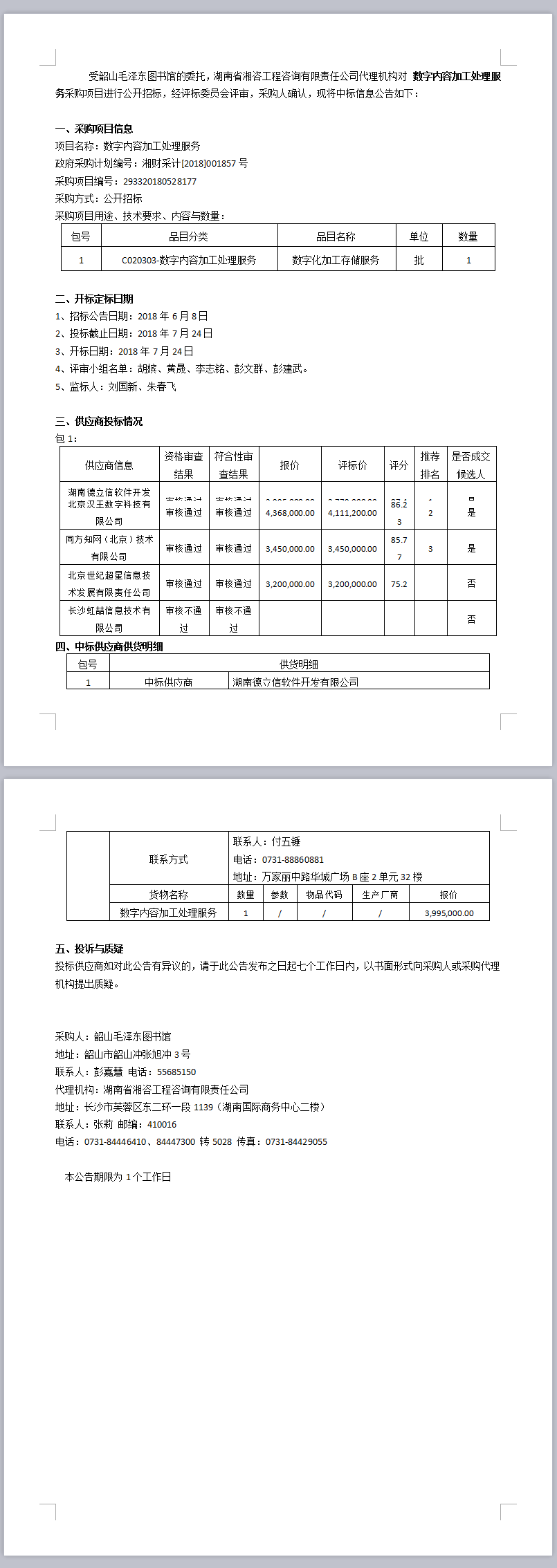 韶山毛泽东图书馆数字内容加工处理服务公开招标中标公告