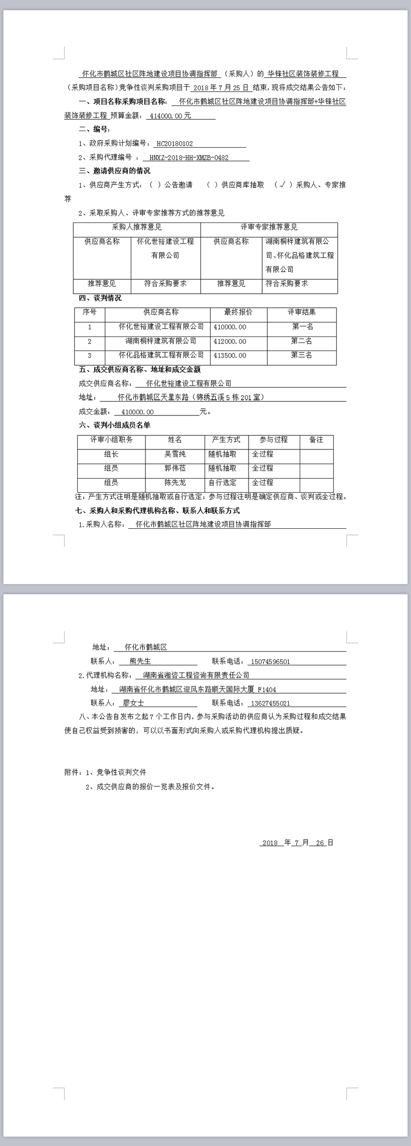 怀化市鹤城区社区阵地建设项目协调指挥部+华锋社区装饰装修工程竞争性谈判成交结果公告