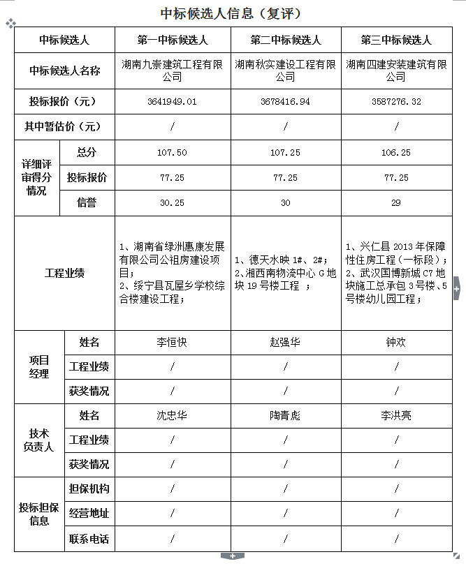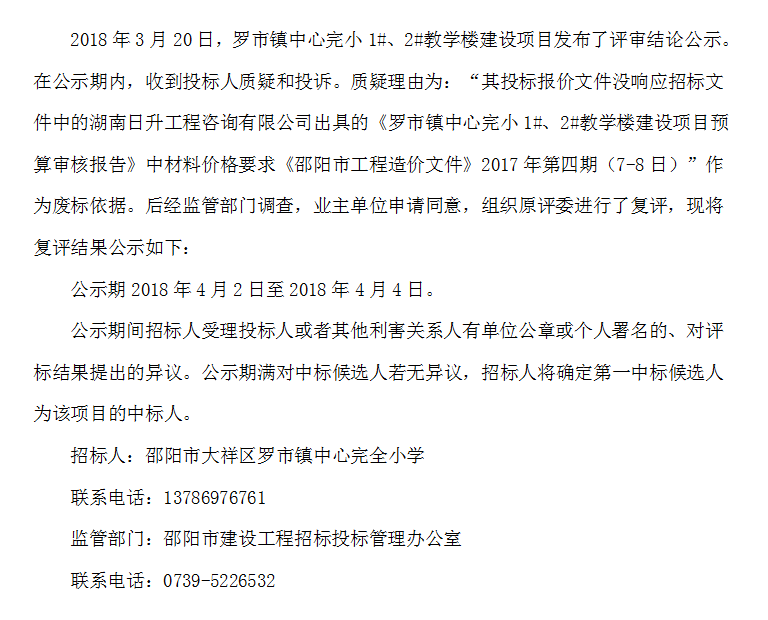 罗市镇中心完小1#、2#教学楼建设项目 招标投标信息公示表(复评)
