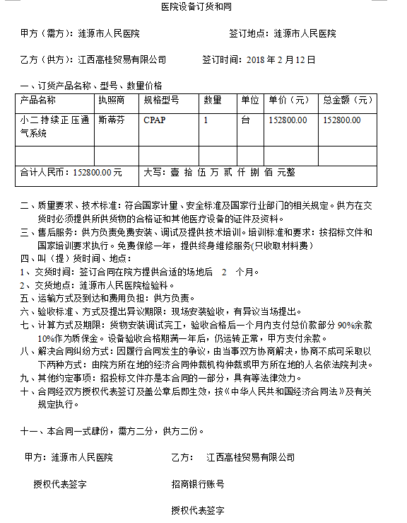涟源市人民医院小儿专用无创呼吸机采购合同