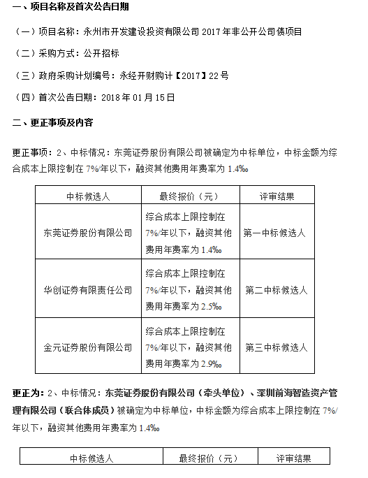 永州市开发建设投资有限公司2017年非公开公司债项目中标公告更正公告