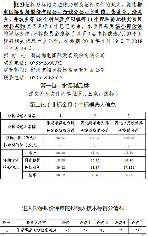 湖南郴电国际发展股份有限公司汝城分公司文明镇、集益乡、濠头乡、井坡乡等28个村网及卢阳镇等11个配网易地扶贫项目材料采购中标候选人公示