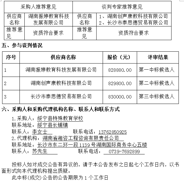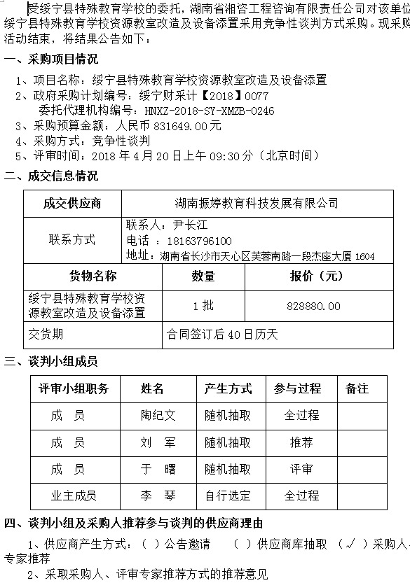 绥宁县特殊教育学校资源教室改造及设备添置谈判成交公告