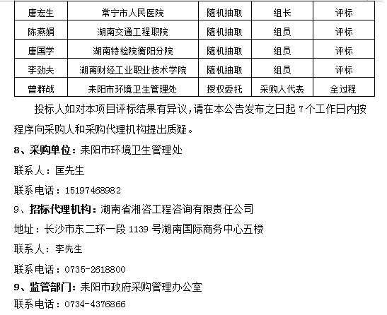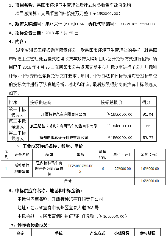 耒阳市环境卫生管理处后挂式垃圾收集车政府采购 评标结果公示