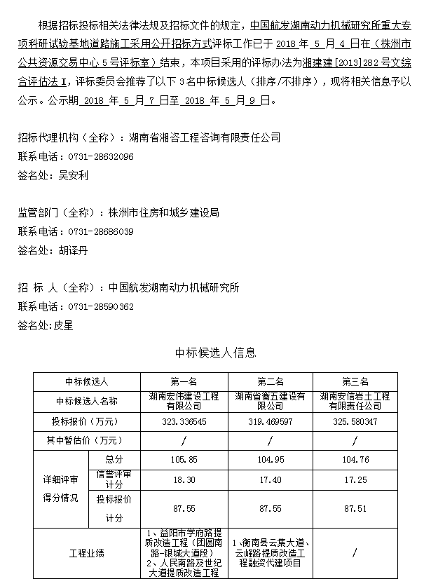 中国航发湖南动力机械研究所重大专项科研试验基地道路施工 招标投标信息公示表