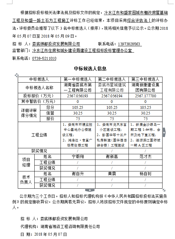 冷水江市和盛家园城市棚改房屋基础工程及和盛一路土石方工程施工中标候选人公示