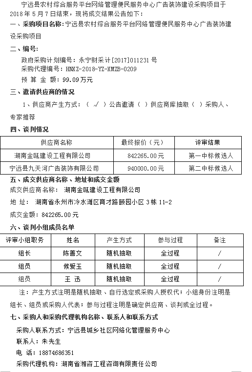 宁远县农村综合服务平台网络管理便民服务中心广告装饰建设采购项目竞争性谈判成交公告