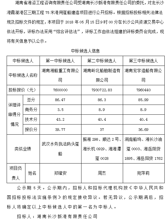 长沙港霞凝港区三期工程75米港用趸船建造项目 中标候选人公示