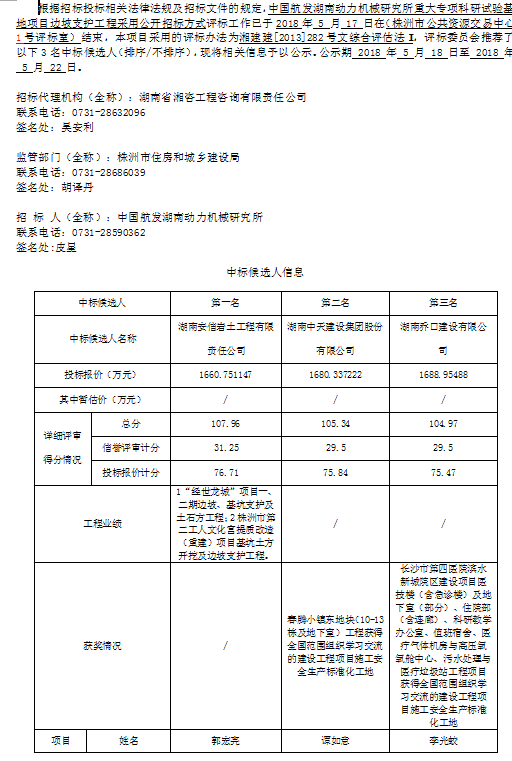 中国航发湖南动力机械研究所重大专项科研试验基地项目边坡支护工程招标投标信息公示表
